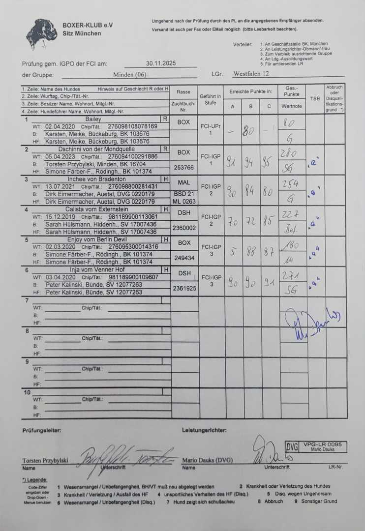 | Maike Vollmann | Isabell vom Brömchen | Boxer | IGP 1 | 75/56/100 A/ nicht bestanden |